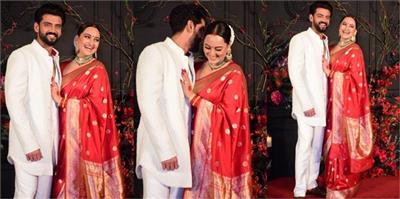 मांग में सिंदूर, माथे पर बिंदी, रेड सिल्क साड़ी..रिसेप्शन पार्टी में सोनाक्षी ने चुराई लाइमलाइट, पति जहीर संग दिए रोमांटिक पोज