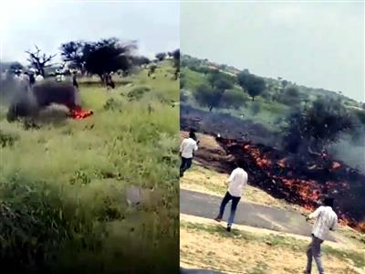 राजस्थान के चुरू में फाइटर प्लेन क्रैश, दूर तक बिखरा जलता हुआ मलबा