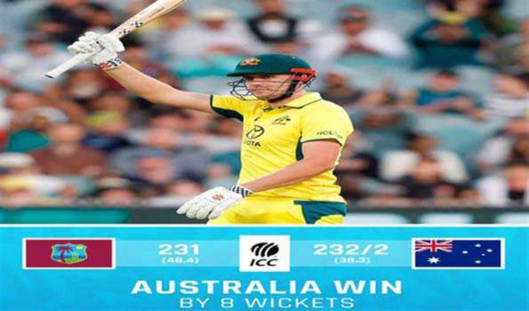 मेलबर्न जेवियर बार्टलेट के चार विकेट के बाद कैमरुन ग्रीन नाबाद 77 रन, कप्तान स्टीव स्मिथ की 79 रन और जोश इंग्लिस 65 रनों की अर्धशतकीय पारी की बदौलत ऑस्ट्रेलिया ने तीन एकदिवसीय मैचों की श्रृंखला के पहले मुकाबले में शुक्रवार को वेस्टइंडीज को आठ विकेट से हराया दिया है। 232 रनों के लक्ष्य का पीछा करने उतरी ऑस्ट्रेलिया की शुरुआत खराब रही और पहले ही ओवर में उसने ट्रैविस हेड चार का विकेट गंवा दिया।