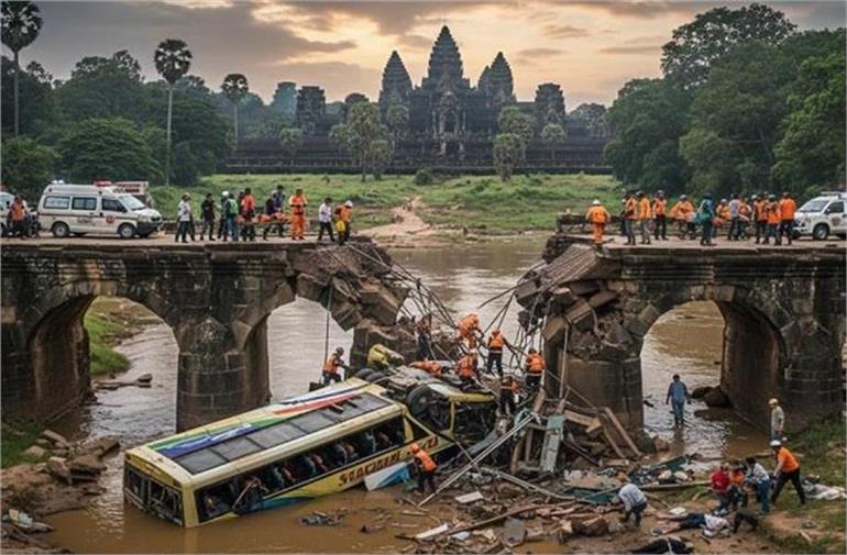 कंबोडिया में बड़ा हादसा: पर्यटन स्थल से आ रही बस पुल से गिरी, 16 यात्रियों की मौके पर मौत, कई घायल