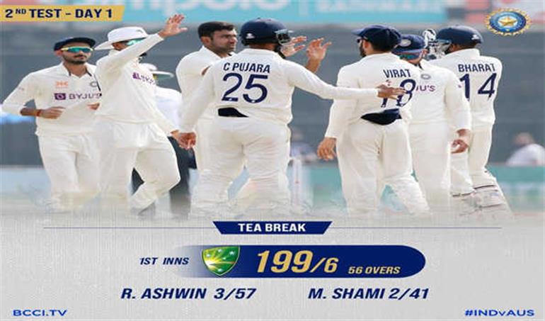 नयी दिल्ली,:  ऑस्ट्रेलिया ने उस्मान ख्वाजा (81) के अर्द्धशतक के दम पर बॉर्डर-गावस्कर ट्रॉफी के दूसरे टेस्ट के पहले दिन शुक्रवार को चाय तक भारत के खिलाफ 199 रन बना लिये, हालांकि वह छह विकेट भी गंवा चुका है।