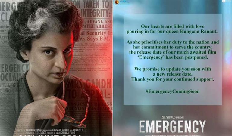 यह फिल्म पूर्व प्रधानमंत्री स्वर्गीय इंदिरा गांधी पर आधारित है। मणिकर्णिकाफिल्मस ने इंस्टाग्राम पर एक पोस्ट डाली है, जिसमें लिखा है हमारे दिल प्यार से भरे हुए हैं, जिस तरह का प्यार कंगना रणौत को आज के समय मिल रहा है, वो हम सभी के लिए देखना काफी खुशनसीबी की बात है। कंगना इस समय अपने देश की सेवा करने में जुटी हुई है। देश के लिए उनका कमिटमेंट इस वक्त प्रायोरिटी है। ऐसे में एमर्जंेसी की रिलीज डेट को टाल दिय गया है। हम वादा करते हैं कि नई रिलीज डेट के साथ हम फिर हाजिर होंगे। आपको निराश नहीं करेंगे। हमें सपोर्ट करें, एमर्जेंसी जल्द रिलीज होगी।