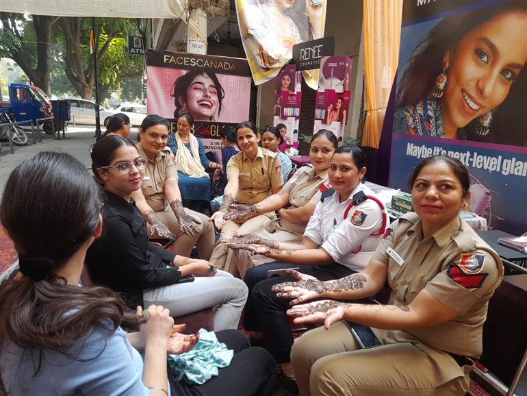 चंडीगढ़(रोशन लाल)करवा चौथ महोत्सव के उपलक्ष्य में सेक्टर 24 स्थित ओंकार मार्केटिंग पर महिलाओं के लिए मेहंदी शिविर आयोजित किया गया। शिविर में महिलाओं के हाथों में सुंदर और आकर्षक डिजाइन की मेहंदी लगाई गई। वहीं चंडीगढ़ पुलिस की लेडी पुलिस कांस्टेबल भी डयूटी और नौकरी के साथ रीति-रिवाजों का भी पालन करते हुए मेहंदी लगवाने पहुंची।