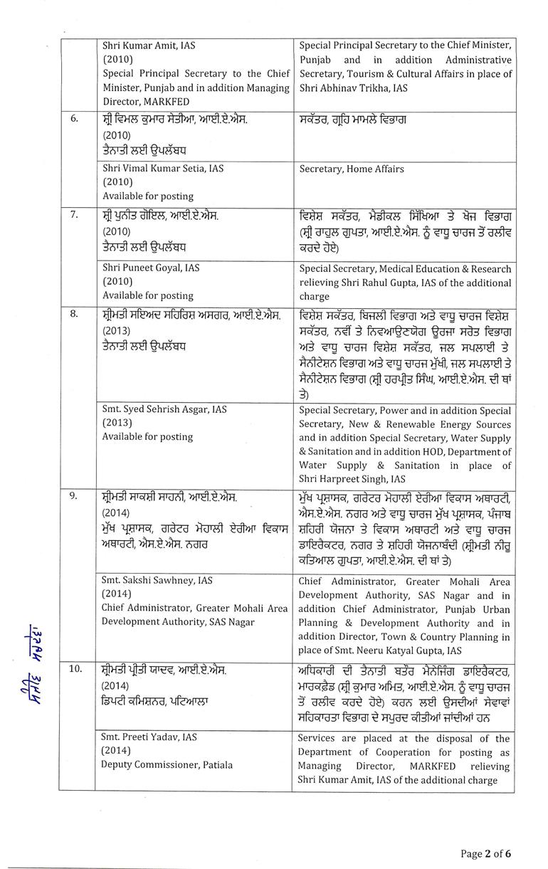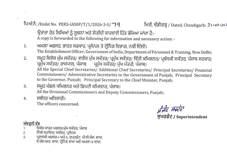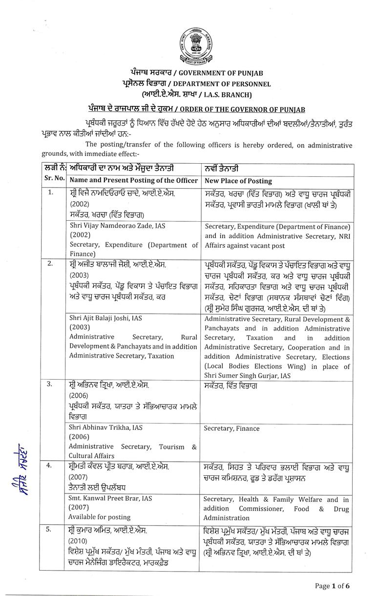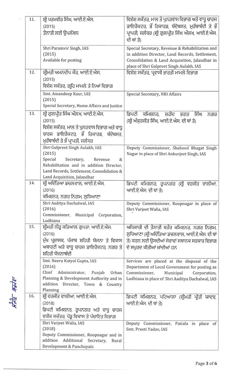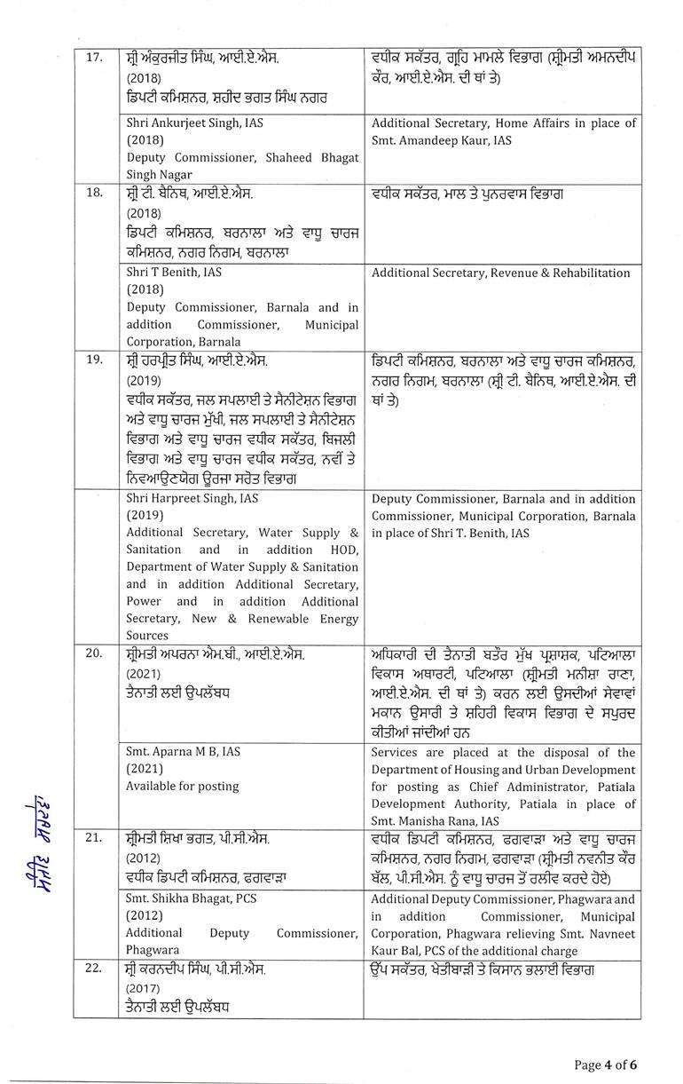 चंडीगढ़/लुधियाना : पंजाब में बड़े पैमाने पर प्रशासनिक फेरबदल किया गया है। इसके तहत 26 बड़े अफसरों का ट्रांसफर किया गया है। 4 जिलों के डिप्टी कमिश्नरों को भी इधर-उधर किया गया है। ऑर्डर के मुताबिक, पटियाला, रूपनगर, शहीद भगत सिंह नगर और बरनाला के डिप्टी कमिश्नरों का ट्रांसफर किया गया है। इसके साथ ही लुधियाना म्युनिसिपल कॉर्पोरेशन कमिश्नर आदित्य डेचलवाल का भी ट्रांसफर किया गया है। पढ़ें पूरी लिस्ट:-