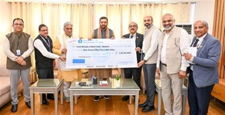 चंडीगढ़ : हरियाणा के मुख्यमंत्री नायब सिंह सैनी को सोमवार को भारतीय स्टेट बैंक (SBI) के अधिकारियों ने मुख्यमंत्री राहत कोष के लिए 1.55 करोड़ रुपये का चेक भेंट किया। यह राशि SBI के कर्मचारियों द्वारा राज्य में चल रहे बाढ़ राहत कार्यों में सहयोग हेतु एक दिन का वेतन दान कर एकत्र की गई है।