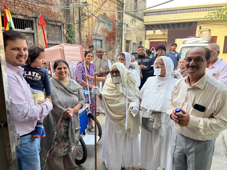 नवांशहर (मनोरंजन कालिया) : जानकारी देते हुए एस एस जैन सभा नवांशहर के प्रधान सुरेंद्र जैन ने बताया कि महासाध्वी श्री प्रियदर्शना जी महाराज, श्री किरण प्रभा जी, श्री रत्न ज्योति जी, श्री विचकशण श्री जी, श्री अर्पिता जी, श्री वंदिता जी एवं श्री मोक्षदा श्री जी महाराज चातुर्मास के बाद नवांशहर के कई गुरु भक्तों के निवास स्थान पर आशीर्वाद देते हुए आज एस एस जैन सभा नवांशहर के महामंत्री रतन कुमार जैन के निवास स्थान पर पहुंचे एवं मंगल पाठ सुना कर आशीर्वाद दिया! रतन जैन के निवास स्थान पर पहुंचने पर उनके पारिवारिक सदस्य सविता जैन, अगम जैन, जयोतिशा जैन, हृदा जैन,त्रिशान जैन, जैन सभा के प्रधान सुरेंद्र जैन एवं अन्य गुरु भक्तों ने स्वागत किया! यहां पर सभी साध्वी जी महाराज ने कई धार्मिक पाठ करके सभी को मंगल पाठ सुना कर आशीर्वाद दिया!