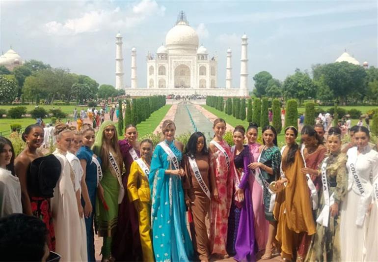 आगरा। मिस टीन इंटरनेशनल की फाइनलिस्ट 24 देशों की सुंदरियों ने मंगलवार को विश्व प्रसिद्ध ताजमहल का दीदार किया। ग्रांड फिनाले से पहले सुंदरियों ने ताजमहल में फोटो सेशन कराया और ताजमहल की खूबसूरती को निहारा।