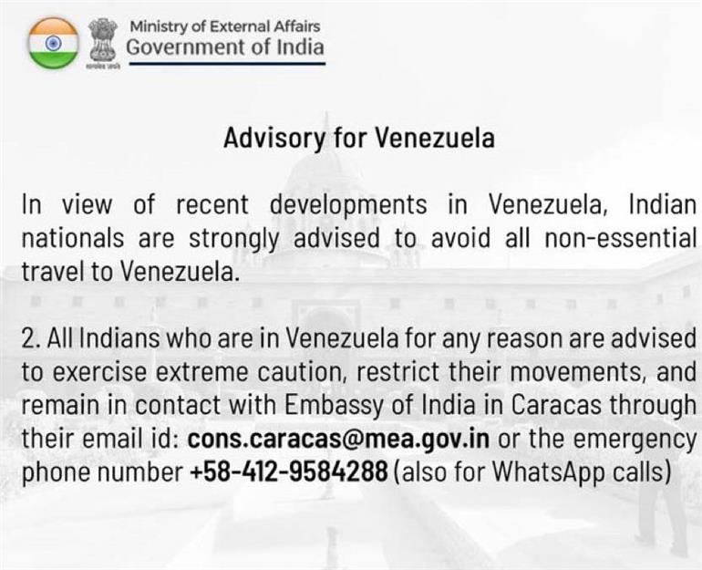 मंत्रालय ने वेनेजुएला में पहले से मौजूद भारतीयों के लिए दिशानिर्देश भी जारी किए हैं, जिसमें उन्हें सतर्क रहने, अपनी गतिविधियों को सीमित रखने और कराकस में भारतीय दूतावास के साथ नियमित संपर्क में रहने की सलाह दी गई है।