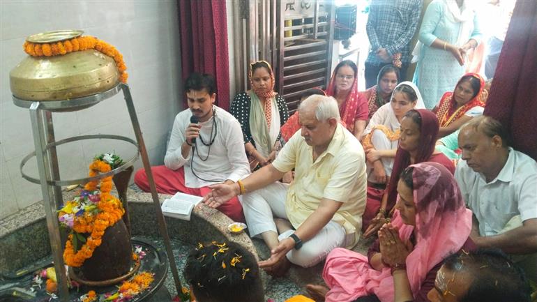 मोहाली ( रोशन लाल ) सावन शिवरात्रि के अवसर पर आज श्री परशुराम मंदिर इंडस्ट्रियल एरिया फेस 9 में हरीद्वार से लाये गए गंगाजल द्वारा शिवलिंग का जल अभिषेक किया गया / इस बारे जानकारी देते हुए ब्राह्मण सभा ( 484,1982 )मोहाली के प्रधान श्री वी वैद्य ने बताया कि श्री हरप्रीत शर्मा एवं उनके परिवार का श्री परशुराम मंदिर में कावड़ लेकर आने पर फूलों की वर्षा एवं ढोल धमाके के साथ मंदिर कमेटी ने सरोपा डालकर उनका स्वागत किया / इसके बाद श्री परशुराम मंदिर के पुजारी द्वारा पूरे विधि विधान से हरीद्वारा से लाये गए गंगा जल से शिवलिंग का जल अभिषेक किया गया एवं शिव आरती के बाद भक्तों को प्रसाद वितरित किया गया/ इस अवसर पर श्री सी के वेद ने शर्मा परिवार का धनबाद करते हुए कहा कि पिछले तीन वर्षों से श्री बलबीर चंद शर्मा के सुपुत्र श्री हरप्रीत शर्मा हरीद्वार से कावड़ लेकर श्री परशुराम मंदिर आ रहे हैं/
