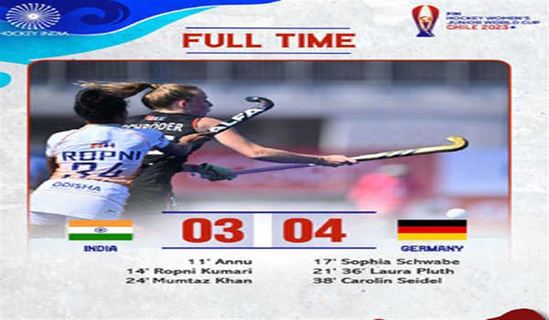 सैंटियागो एफआईएच हॉकी महिला जूनियर विश्वकप में शुक्रवार को रोमांचक मुकाबले में जर्मनी के हाथो भारत को 4-3 से हार का सामना करना पड़ा। चिली के सैंटियागो में आज खेले गये मुकाबले में भारत की ओर से अन्नु ने 11वें मिनट में, रोपनी कुमारी ने 14वें मिनट में और मुमताज खान ने 24वें मिनट में गोल किये। वहीं जर्मनी की ओर से सोफिया श्वाबे ने 17वें मिनट में, लौरा प्लथ ने 21वें और 36वें मिनट में और कैरोलिन सेइडेल ने 38वें मिनट में गोल दागे।