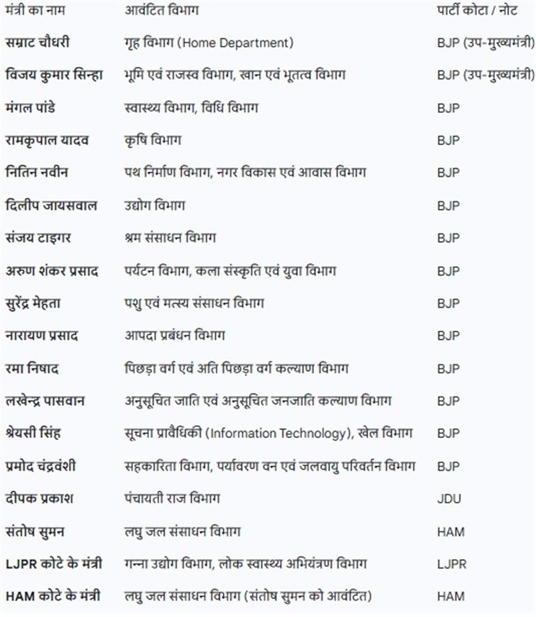 गृह विभाग बीजेपी कोटे से आने वाले डिप्टी सीएम सम्राट चौधरी को सौंपा गया है। अब सम्राट चौधरी राज्य में कानून-व्यवस्था और आंतरिक सुरक्षा की कमान संभालेंगे। दूसरे डिप्टी सीएम विजय कुमार सिन्हा को भूमि एवं राजस्व विभाग के अलावा खान एवं भूतत्व विभाग की जिम्मेदारी मिली है। बीजेपी के वरिष्ठ नेता रामकृपाल यादव को कृषि विभाग मिला है, जो सरकार के प्रमुख मंत्रालयों में से एक माना जाता है।