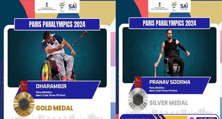 पेरिस। भारतीय पैरा एथलीट धर्मबीर और प्रणव सूरमा ने पुरुष क्लब थ्रो एफ 51 स्पर्धा में शानदार प्रदर्शन करते हुए क्रमश: स्वर्ण और रजत पदक जीते हैं। बुधवार देर रात क्लब थ्रो के फाइनल मुकाबले में पैरा एथलीट धर्मबीर ने 34.92 मीटर का थ्रो कर शीर्ष स्थान के साथ स्वर्ण पदक अपने नाम किया। वहीं हमवतन प्रणव सूरमा ने 34.59 मीटर थ्रो के साथ रजत जीता। यह पहली बार है जब भारत ने पैरालंपिक खेलों में पैराक्लब थ्रो स्पर्धा में पदक जीता है। इस बीच अमित कुमार 23.96 मीटर के सर्वश्रेष्ठ थ्रो के साथ 10वें स्थान पर रहे।