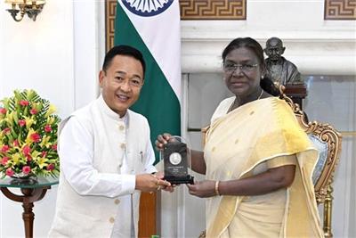 ਰਾਸ਼ਟਰਪਤੀ ਮੁਰਮੂ ਨੂੰ ਮਿਲੇ ਸਿੱਕਮ ਦੇ CM, ਸਿੱਕਾ ਅਤੇ ਡਾਕ ਟਿਕਟ ਕੀਤਾ ਭੇਟ