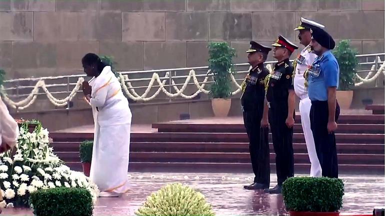 ਭਾਰਤ ਦੇਸ਼ ਨੇ ਬੀਤੇ ਸ਼ੁੱਕਰਵਾਰ ਨੂੰ ਆਜ਼ਾਦੀ ਦੇ 78ਵੇਂ ਸਾਲ ਦਾ ਜਸ਼ਨ ਮਨਾਇਆ ਹੈ। ਦੇਸ਼ ਭਰ ਦੇ ਨੇਤਾਵਾਂ ਨੇ ਰਾਸ਼ਟਰੀ ਝੰਡਾ ਲਹਿਰਾਇਆ ਅਤੇ ਵੱਖ-ਵੱਖ ਥਾਵਾਂ 'ਤੇ ਸ਼ਹੀਦਾਂ ਨੂੰ ਸ਼ਰਧਾਂਜਲੀਆਂ ਭੇਟ ਕੀਤੀਆਂ। ਰਾਸ਼ਟਰਪਤੀ ਦ੍ਰੋਪਦੀ ਮੁਰਮੂ ਨੇ ਵੀ ਦੇਸ਼ ਲਈ ਆਪਣੀਆਂ ਜਾਨਾਂ ਕੁਰਬਾਨ ਕਰਨ ਵਾਲੇ ਫੌਜੀਆਂ ਨੂੰ ਸ਼ਰਧਾਂਜਲੀ ਭੇਟ ਕੀਤੀ। ਉਨ੍ਹਾਂ ਨੇ ਦਿੱਲੀ ਵਿੱਚ ਰਾਸ਼ਟਰੀ ਯੁੱਧ ਸਮਾਰਕ 'ਤੇ ਫੁੱਲਮਾਲਾ ਭੇਟ ਕੀਤੀ। ਉਨ੍ਹਾਂ ਦੇ ਨਾਲ ਰੱਖਿਆ ਮੰਤਰੀ ਰਾਜਨਾਥ ਸਿੰਘ ਦੇ ਨਾਲ ਚੋਟੀ ਦੇ ਫੌਜੀ ਨੇਤਾ ਵੀ ਮੌਜੂਦ ਸਨ। ਇਸ ਪਲ ਦੀਆਂ ਤਸਵੀਰਾਂ ਸੋਸ਼ਲ ਮੀਡੀਆ 'ਤੇ ਵਾਇਰਲ ਹੋ ਗਈਆਂ ਹਨ, ਜਿਸ ਵਿੱਚ ਕਈਆਂ ਨੇ ਨੋਟ ਕੀਤਾ ਹੈ ਕਿ ਇਹ ਸਮਾਰੋਹ ਰਾਸ਼ਟਰੀ ਰਾਜਧਾਨੀ ਵਿੱਚ ਮੀਂਹ ਦੇ ਵਿਚਕਾਰ ਸੰਪਨ ਹੋਇਆ ਸੀ।