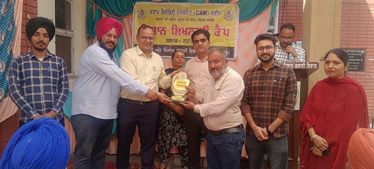 ਨਵਾਂਸ਼ਹਿਰ (ਮਨੋਰੰਜਨ ਕਾਲੀਆ) : ਖੇਤੀਬਾੜੀ ਅਤੇ ਕਿਸਾਨ ਭਲਾਈ ਵਿਭਾਗ ਬਲਾਕ ਨਵਾਂਸ਼ਹਿਰ ਵਲੋਂ ਫ਼ਸਲੀ ਰਹਿੰਦ-ਖੂਹੰਦ ਨਾ ਸਾੜਨ ਲਈ ਚਲਾਈ ਮੁਹਿੰਮ ਤਹਿਤ ਬਲਾਕ ਪੱਧਰੀ ਕਿਸਾਨ ਜਾਗਰੂਕਤਾ ਕੈਂਪ ਦੌਰਾਨ ਪਰਾਲੀ ਨਾ ਸਾੜਨ ਵਾਲੇ ਅਗਾਂਹਵਧੂ ਕਿਸਾਨਾਂ ਦਾ ਸਨਮਾਨ ਕੀਤਾ ਗਿਆ।
