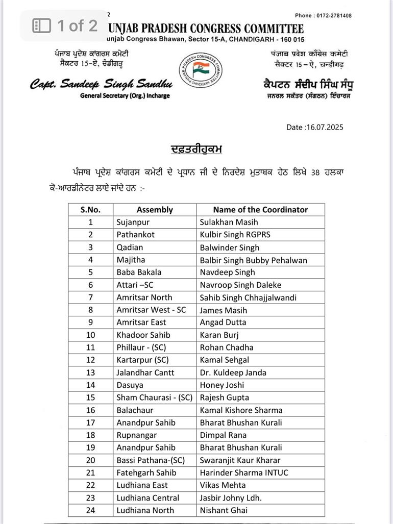 ਚੰਡੀਗੜ੍ਹ : ਪੰਜਾਬ ਕਾਂਗਰਸ ਵੱਲੋਂ ਨਵੇਂ ਹਲਕਾ ਕੋ-ਆਰਡੀਨੇਟਰਾਂ ਅਤੇ ਸੰਗਠਨ ਆਬਜ਼ਰਵਰਾਂ ਦਾ ਐਲਾਨ ਕੀਤਾ ਗਿਆ ਹੈ। ਪਾਰਟੀ ਦੇ ਜਨਰਲ ਸਕੱਤਰ ਇੰਚਾਰਜ ਕੈਪਟਨ ਸੰਦੀਪ ਸਿੰਘ ਸੰਧੂ ਵੱਲੋਂ ਇਨ੍ਹਾਂ ਆਗੂਆਂ ਦੀਆਂ ਲਿਸਟਾਂ ਵੀ ਜਾਰੀ ਕਰ ਦਿੱਤੀਆਂ ਗਈਆਂ ਹਨ।