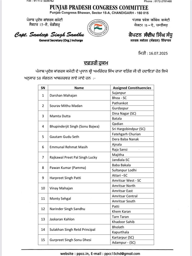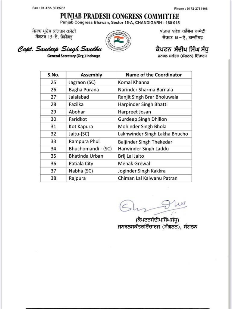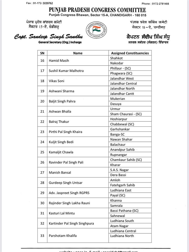ਇਸ ਸਬੰਧੀ ਜਾਣਕਾਰੀ ਸਾਂਝੀ ਕਰਦਿਆਂ ਕੈਪਟਨ ਸੰਧੂ ਨੇ ਦੱਸਿਆ ਕਿ ਪੰਜਾਬ ਪ੍ਰਦੇਸ਼ ਕਾਂਗਰਸ ਕਮੇਟੀ ਦੇ ਪ੍ਰਧਾਨ ਅਮਰਿੰਦਰ ਸਿੰਘ ਰਾਜਾ ਵੜਿੰਗ ਦੇ ਦਿਸ਼ਾ-ਨਿਰਦੇਸ਼ਾਂ ਅਨੁਸਾਰ ਅਹੁਦੇਦਾਰਾਂ ਦਾ ਐਲਾਨ ਕੀਤਾ ਗਿਆ ਹੈ। ਪੰਜਾਬ ਕਾਂਗਰਸ ਵੱਲੋਂ ਜਾਰੀ ਕੀਤੀ ਗਈ ਸੂਚੀ ਵਿਚ 38 ਹਲਕਾ ਕੋ-ਆਰਡੀਨੇਟਰਾਂ ਅਤੇ 58 ਸੰਗਠਨ ਆਬਜ਼ਰਵਰਾਂ ਦੇ ਨਾਂ ਸ਼ਾਮਲ ਹਨ। ਪੜ੍ਹੋ ਪੂਰੀ ਸੂਚੀ: