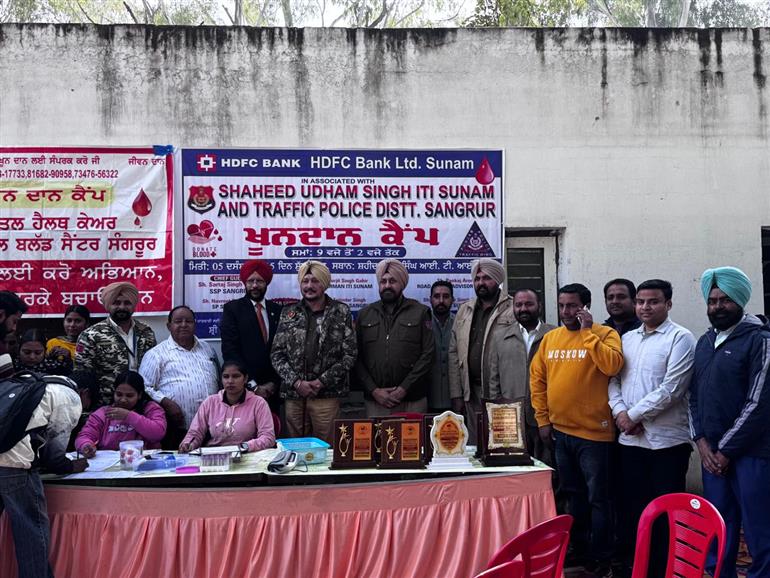 ਸੁਨਾਮ (ਰਮੇਸ਼ ਗਰਗ) ; ਟਰੈਫਿਕ ਪੁਲਿਸ ਸੁਨਾਮ ਵੱਲੋਂ ਆਈ, ਟੀ, ਆਈ ਮੈਂਨੇਜਮੈਂਟ ਅਤੇ ਐਚ, ਡੀ, ਐਫ, ਸੀ ਬੈਂਕ ਦੇ ਸਹਿਯੋਗ ਨਾਲ ਆਈ ਟੀ,ਆਈ ਵਿੱਖੇ ਖੂਨ ਦਾਨ ਕੈਂਪ ਲਾਇਆ ਗਿਆ। ਇਸ ਕੈਂਪ ਵਿੱਚ ਮਿੱਤਲ ਆਈ ਕੇਅਰ ਹਸਪਤਾਲ ਤੇ ਬਲੱਡ ਸੈਂਟਰ ਸੰਗਰੂਰ ਦੀ ਟੀਮ ਨੇ ਖੂਨ ਇਕੱੱਤਰ ਕੀਤਾ। ਇਸ ਮੌਕੇ ਹੋਏ ਸਮਾਗਮ ਵਿੱਚ ਜਿਲ੍ਹਾ ਸੰਗਰੂਰ ਦੇ ਐਸ ਪੀ ਸ, ਨਵਰੀਤ ਸਿੰਘ ਵਿਰਕ ਬਤੌਰ ਮੁੱਖ ਮਹਿਮਾਨ ਸਾ਼ਮਲ ਹੋਏ। ਉਨ੍ਹਾਂ ਨਾਲ ਜਿਲ੍ਹਾ ਟਰੈਫਿਕ ਦੇ ਡੀ, ਐਸ, ਪੀ ਸ, ਤੇਜਿੰਦਰ ਸਿੰਘ ਬਤੌਰ ਵਿਸੇ਼ਸ਼ ਮਹਿਮਾਨ ਸਾ਼ਮਲ ਹੋਏ। ਇਸ ਮੌਕੇ ਤੇ ਇਕੱਠ ਨੂੰ ਸੰਬੋਧਨ ਕਰਦਿਆਂ ਐਸ, ਪੀ ਸ, ਨਵਰੀਤ ਸਿੰਘ ਵਿਰਕ ਨੇ ਵਿਦਿਆਰਥੀਆਂ ਨੂੰ ਅਪੀਲ ਕੀਤੀ ਕਿ ਉਹ ਹੁਣੇ ਤੋਂ ਹੀ ਆਪਣਾ ਭਵਿੱਖ ਉਜਵਲਾ ਕਰਨ ਵੱਲ ਧਿਆਨ ਦੇਣ ਤੇ ਵਧੀਆ ਜਿੰਦਗੀ ਜਿਉਣ ਦੇ ਤੌਰ ਤਰੀਕਿਆਂ ਨੂੰ ਫਾਲੋ ਕਰਨ। ਆਪਣਾ ਬਹੁਤਾ ਸਮਾਂ ਆਪਣੀ ਪੜ੍ਹਾਈ ਤੇ ਆਪਣੇ ਕੈਰੀਅਰ ਵੱਲ ਦੇਣ ਤਾਂ ਕਿ ਉਨ੍ਹਾਂ ਨੂੰ ਜਿੰਦਗੀ ਵਿੱਚ ਕਿਸੇ ਦਿੱਕਤ ਦਾ ਸਾਹਮਣਾ ਨਾ ਕਰਨਾ ਪਵੇ। ਉਨ੍ਹਾਂ ਖੂਨ ਦਾਨ ਕੈਂਪ ਲਾਉਣ ਲਈ ਟਰੈਫਿਕ ਪੁਲਿਸ ਸੁਨਾਮ, ਆਈ ਟੀ ਆਈ ਮੈਂਨੇਜਮੈਂਟ ਤੇ ਐਚ,ਡੀਐਫ, ਸੀ ਬੈਂਕ ਦਾ ਧੰਨਵਾਦ ਕੀਤਾ ਜਿਨ੍ਹਾਂ ਨੇ ਮਿਲਕੇ ਇਸ ਪੁੰਨ ਦੇ ਕੰਮ ਵਿੱਚ ਹਿਸਾ ਪਾਇਆ।