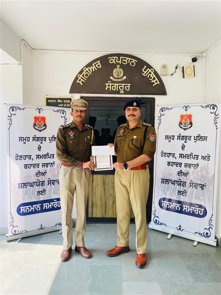 ਸੁਨਾਮ ਉਧਮ ਸਿੰਘ ਵਾਲਾ (ਰਮੇਸ਼ ਗਰਗ) : ਸੁਨਾਮ ਦੇ ਥਾਣਾ ਮੁਖੀ ਪ੍ਰਤੀਕ ਜਿੰਦਲ ਦੀ ਵਧੀਆ ਕਾਰਜ ਗੁਰਾਰੀ ਦੇ ਚਲਦੇ ਅੱਜ ਐਸਐਸਪੀ ਸੰਗਰੂਰ ਸਰਦਾਰ ਸਰਤਾਜ ਸਿੰਘ ਚਾਹਲ ਵੱਲੋਂ ਉਹਨਾਂ ਨੂੰ ਵਿਸ਼ੇਸ਼ ਤੌਰ ਤੇ ਸਨਮਾਨਿਤ ਕੀਤਾ ਗਿਆ।