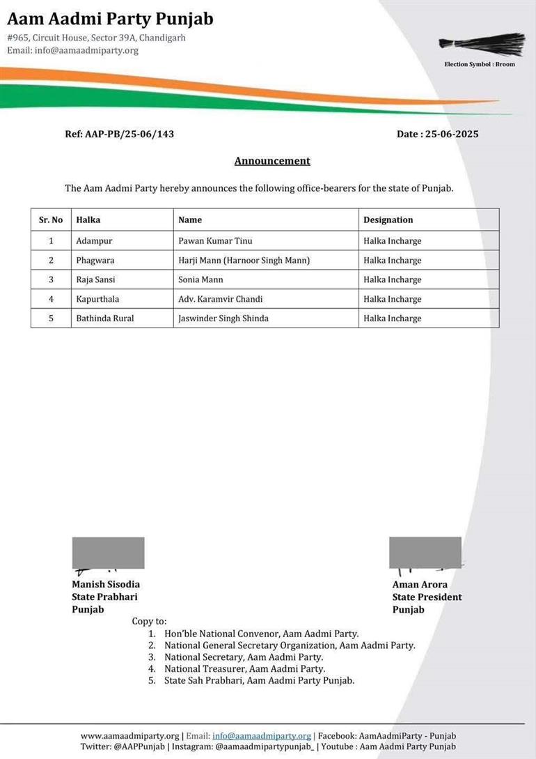 ਉਥੇ ਹੀ ਆਮ ਆਦਮੀ ਪਾਰਟੀ ਨੇ ਸੋਨੀਆ ਮਾਨ ਨੂੰ ਹਲਕਾ ਰਾਜਾਸਾਂਸੀ ਦਾ ਇੰਚਾਰਜ ਨਿਯੁਕਤ ਕੀਤਾ ਹੈ। ਬਲਦੇਵ ਸਿੰਘ ਮਿਆਦੀਆਂ ਹਲਕਾ ਰਾਜਾਸਾਂਸੀ ਦੇ ਇੰਚਾਰਜ ਸਨ। ਆਦਮਪੁਰ ਤੋਂ ਪਵਨ ਕੁਮਾਰ ਟੀਨੂੰ ਨੂੰ ਹਲਕਾ ਇੰਚਾਰਜ ਨਿਯੁਕਤ ਕੀਤਾ ਗਿਆ ਹੈ। ਇਸੇ ਤਰ੍ਹਾਂ ਐਡਵੋਕੇਟ ਕਰਮਵੀਰ ਚਾਂਦੀ ਨੂੰ ਕਪੂਰਥਲਾ ਤੋਂ ਜਦਕਿ ਜਸਵਿੰਦਰ ਸਿੰਘ ਸਿਨਹਾ ਨੂੰ ਦਿਹਾਤੀ ਬਠਿੰਡਾ ਤੋਂ ਇੰਚਾਰਜ ਲਾਇਆ ਗਿਆ ਹੈ।
