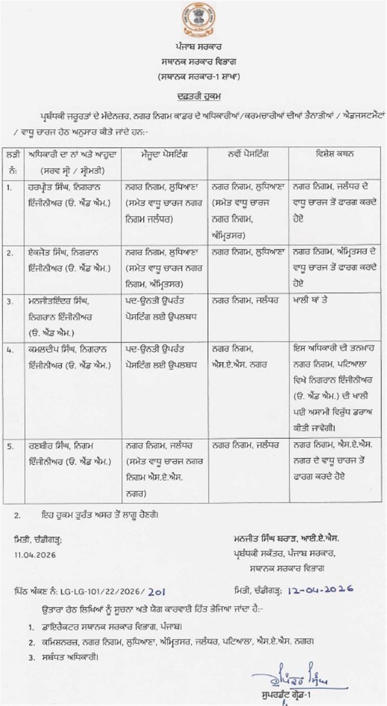 ਹੁਕਮਾਂ ਮੁਤਾਬਕ, ਹਰਪ੍ਰੀਤ ਸਿੰਘ ਨਗਰ ਨਿਗਮ ਦਾ ਵਾਧੂ ਚਾਰਜ ਵਾਪਸ ਲੈ ਕੇ ਮਨਜੀਤਇੰਦਰ ਸਿੰਘ ਨੂੰ ਸੌਂਪ ਦਿੱਤਾ ਗਿਆ ਹੈ। ਇਸੇ ਤਰ੍ਹਾਂ ਏਕਜੋਤ ਸਿੰਘ ਨੂੰ ਨਗਰ ਨਿਗਮ ਅੰਮ੍ਰਿਤਸਰ ਦੇ ਵਾਧੂ ਚਾਰਜ ਤੋਂ ਫ਼ਾਰਗ ਕਰ ਦਿੱਤਾ ਗਿਆ ਹੈ। ਕਮਲਦੀਪ ਸਿੰਘ ਨੂੰ ਪਦ ਉਨਤੀ ਮਗਰੋਂ ਨਗਰ ਨਿਗਮ ਐੱਸ. ਏ. ਐੱਸ. ਵਿਚ ਤਾਇਨਾਤ ਕੀਤਾ ਗਿਆ ਹੈ, ਇਸ ਦਾ ਵਾਧੂ ਚਾਰਜ ਪਹਿਲਾਂ ਰਣਬੀਰ ਸਿੰਘ ਕੋਲ ਸੀ, ਜਿਨ੍ਹਾਂ ਨੂੰ ਇਸ ਤੋਂ ਫ਼ਾਰਗ ਕਰ ਦਿੱਤਾ ਗਿਆ ਹੈ।