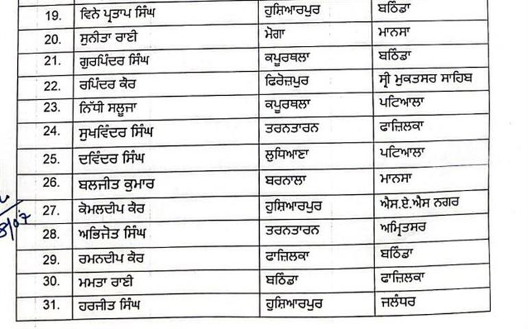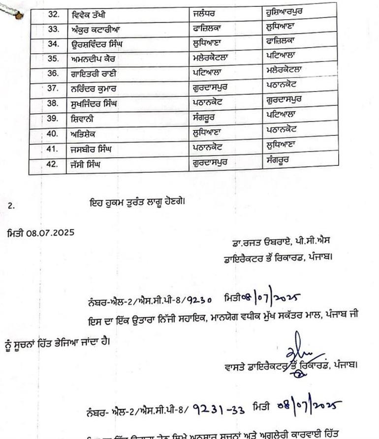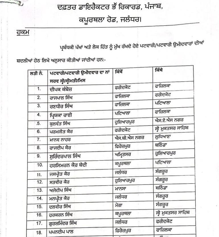 ਚੰਡੀਗੜ੍ਹ : ਪੰਜਾਬ ਸਰਕਾਰ ਵੱਲੋਂ ਸੂਬੇ ਵਿਚ ਵੱਡੇ ਪੱਧਰ 'ਤੇ ਪਟਵਾਰੀਆਂ ਦੀਆਂ ਬਦਲੀਆਂ ਕੀਤੀਆਂ ਗਈਆਂ ਹਨ। ਇਹ ਬਦਲੀਆਂ ਪ੍ਰਬੰਧਕੀ ਪੱਖਾਂ ਅਤੇ ਲੋਕ ਹਿੱਤ ਨੂੰ ਮੁੱਖ ਰੱਖਦੇ ਹੋਏ ਕੀਤੀਆਂ ਗਈਆਂ ਹਨ। ਪੰਜਾਬ ਸਰਕਾਰ ਵੱਲੋਂ ਜਾਰੀ ਹੁਕਮਾਂ ਵਿਚ ਕਿਹਾ ਗਿਆ ਹੈ ਕਿ ਇਹ ਬਦਲੀਆਂ ਤੁਰੰਤ ਪ੍ਰਭਾਵ ਤੋਂ ਲਾਗੂ ਹੁੰਦੀਆਂ ਹਨ। ਸਰਕਾਰ ਵੱਲੋਂ ਜਾਰੀ ਨੋਟੀਫਿਕੇਸ਼ਨ ਮੁਤਾਬਕ ਪੰਜਾਬ ਭਰ ਵਿਚ ਲਗਭਗ 42 ਪਟਵਾਰੀਆਂ ਦੀਆਂ ਬਦਲੀਆਂ ਕੀਤੀਆਂ ਗਈਆਂ ਹਨ। ਬਦਲੀਆਂ ਦੀ ਪੂਰੀ ਸੂਚੀ ਤੁਸੀਂ ਖ਼ਬਰ ਵਿਚ ਹੇਠਾਂ ਦੇਖ ਸਕਦੇ ਹੋ।