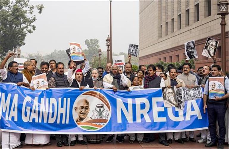 ਵਿਰੋਧੀ ਸੰਸਦ ਮੈਂਬਰਾਂ ਨੇ 'ਗਰੀਬਾਂ ਦਾ ਅਧਿਕਾਰ ਵਾਪਸ ਦਿਓ' ਅਤੇ 'ਤਾਨਾਸ਼ਾਹੀ ਨਹੀਂ ਚੱਲੇਗੀ' ਦੇ ਨਾਅਰੇ ਲਗਾਏ। ਖੜਗੇ ਨੇ ਕਿਹਾ,''ਅੱਜ ਗੱਲ ਸਿਰਫ਼ ਮਨਰੇਗਾ ਦਾ ਨਾਂ ਬਦਲਣ ਤੱਕ ਸੀਮਿਤ ਨਹੀਂ ਹੈ ਸਗੋਂ ਇਹ ਕੰਮ ਦੇ ਅਧਿਕਾਰ ਨੂੰ ਖੋਹੇ ਜਾਣ ਦੀ ਗੱਲ ਹੈ। ਸਰਕਾਰ ਉਸ ਅਧਿਕਾਰ ਨੂੰ ਖੋਹ ਰਹੀ ਹੈ, ਜੋ ਅਸੀਂ ਦਿੱਤਾ ਸੀ। ਇਸ ਨਵੇਂ ਕਾਨੂੰਨ 'ਚ ਸਰਕਾਰ ਦਾ ਜਦੋਂ ਮਨ ਹੋਵੇਗਾ, ਉਦੋਂ ਉਹ ਕੰਮ ਦੇਵੇਗੀ... ਬਾਅਦ 'ਚ ਇਹ ਬੋਲ ਕੇ ਕੰਮ ਦੇਮ ਤੋਂ ਮਨ੍ਹਾਂ ਕਰ ਦੇਵੇਗੀ ਕਿ ਅਜੇ ਮੰਗ ਨਹੀਂ ਹੈ।'' ਉਨ੍ਹਾਂ ਦਾ ਕਹਿਣਾ ਸੀ ਕਿ ਇਹ ਇਕ ਵੱਡਾ ਮੁੱਦਾ ਹੈ ਅਤੇ ਪਿਛਲੇ ਵਰਗ, ਦਲਿਤ ਵਰਗ ਦੇ ਨਾਲ ਗਰੀਬਾਂ ਦੇ ਅਧਿਕਾਰਾਂ 'ਤੇ ਹਮਲਾ ਹੈ। ਕਾਂਗਰਸ ਪ੍ਰਧਾਨ ਨੇ ਕਿਹਾ,''ਅਸੀਂ ਲੋਕਾਂ ਦੇ ਅਧਿਕਾਰ ਲਈ ਹਰ ਸੂਬੇ ਅਤੇ ਜ਼ਿਲ੍ਹੇ 'ਚ ਲੜਾਂਗੇ। ਇਹ ਸਿਰਫ਼ ਮਹਾਤਮਾ ਗਾਂਧੀ ਜੀ ਦੇ ਨਾਂ ਦੀ ਗੱਲ ਨਹੀਂ ਸਗੋਂ ਸਵਾਲ ਅਧਿਕਾਰਾਂ ਦਾ ਵੀ ਹੈ।''