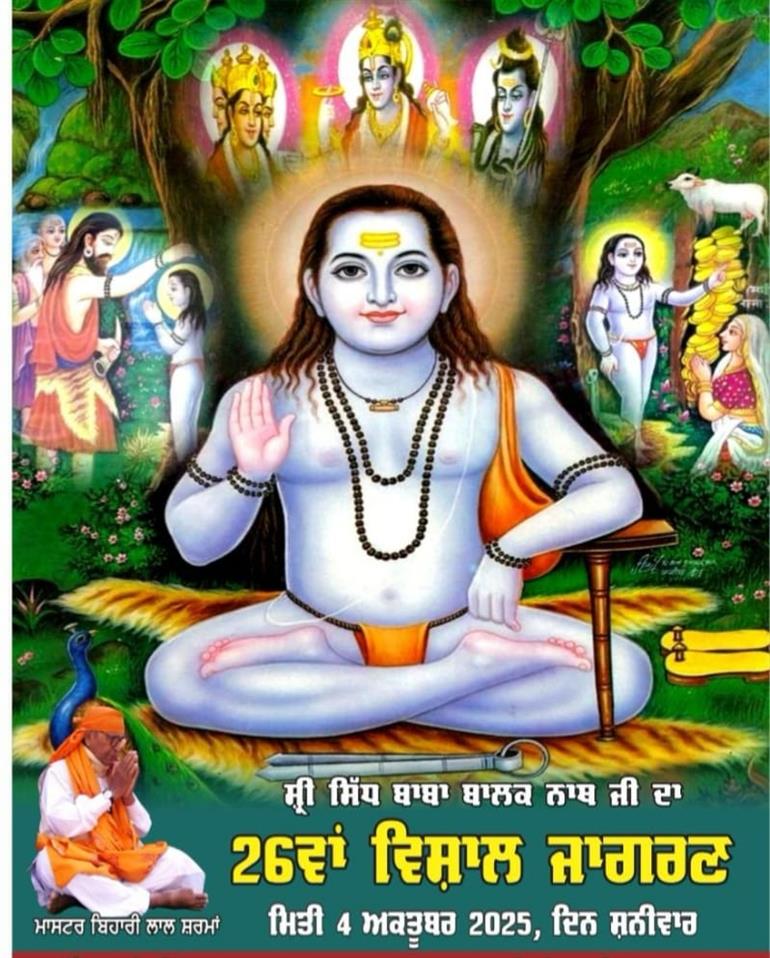 ਮਾਸਟਰ ਬਿਹਾਰੀ ਲਾਲ ਸ਼ਰਮਾਂ ਦੀ ਪਵਿੱਤਰ ਯਾਦ ਨੂੰ ਸਮਰਪਿਤ ਸ੍ਰੀ ਸਿੱਧ ਬਾਬਾ ਬਾਲਕ ਨਾਥ ਜੀ ਦਾ 26ਵਾਂ ਵਿਸ਼ਾਲ ਜਾਗਰਣ 4 ਅਕਤੂਬਰ ਨੂੰ