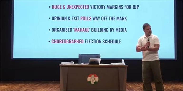 ਮਹਾਰਾਸ਼ਟਰ ਅਤੇ ਹਰਿਆਣਾ ਵਿਧਾਨ ਸਭਾ ਚੋਣਾਂ ਦਾ ਹਵਾਲਾ ਦਿੰਦੇ ਹੋਏ ਉਨ੍ਹਾਂ ਕਿਹਾ ਕਿ ਸਰਵੇਖਣ ਕੁਝ ਕਹਿ ਰਹੇ ਸਨ, ਪਰ ਨਤੀਜੇ ਕੁਝ ਹੋਰ ਨਿਕਲੇ। ਕਾਂਗਰਸ ਨੇਤਾ ਨੇ ਕਿਹਾ, "ਜਦੋਂ ਈਵੀਐਮ ਨਹੀਂ ਸੀ, ਤਾਂ ਪੂਰਾ ਦੇਸ਼ ਇੱਕ ਦਿਨ ਵੋਟ ਪਾਉਂਦਾ ਸੀ, ਪਰ ਅੱਜ ਦੇ ਯੁੱਗ ਵਿੱਚ ਵੋਟਿੰਗ ਕਈ ਪੜਾਵਾਂ ਵਿੱਚ ਹੁੰਦੀ ਹੈ... ਅਜਿਹੀ ਸਥਿਤੀ ਵਿੱਚ, ਲੰਬੇ ਸਮੇਂ ਤੱਕ ਸ਼ੱਕ ਦੀ ਸਥਿਤੀ ਬਣੀ ਰਹੀ।" ਰਾਹੁਲ ਗਾਂਧੀ ਨੇ ਦਾਅਵਾ ਕੀਤਾ ਕਿ ਲੋਕ ਸਭਾ ਚੋਣਾਂ ਤੋਂ ਬਾਅਦ, ਮਹਾਰਾਸ਼ਟਰ ਵਿੱਚ ਪੰਜ ਮਹੀਨਿਆਂ ਦੇ ਅੰਦਰ ਇੰਨੇ ਵੋਟਰਾਂ ਦੇ ਨਾਮ ਜੋੜੇ ਗਏ, ਜੋ ਪਹਿਲੇ ਪੰਜ ਸਾਲਾਂ ਦੀ ਮਿਆਦ ਵਿੱਚ ਨਹੀਂ ਜੋੜੇ ਗਏ ਸਨ। ਉਨ੍ਹਾਂ ਕਿਹਾ, "ਲੋਕ ਸਭਾ ਚੋਣਾਂ ਅਤੇ ਵਿਧਾਨ ਸਭਾ ਚੋਣਾਂ ਦੌਰਾਨ ਮਹਾਰਾਸ਼ਟਰ ਵਿੱਚ ਇੱਕ ਕਰੋੜ ਵੋਟਰ ਵਧੇ। ਅਸੀਂ ਚੋਣ ਕਮਿਸ਼ਨ ਕੋਲ ਗਏ...ਅਸੀਂ ਪੂਰੇ ਯਕੀਨ ਨਾਲ ਕਿਹਾ ਕਿ ਮਹਾਰਾਸ਼ਟਰ ਵਿੱਚ ਚੋਣ ਚੋਰੀ ਹੋਈ ਸੀ।" ਉਨ੍ਹਾਂ ਦੇ ਅਨੁਸਾਰ, ਚੋਣ ਕਮਿਸ਼ਨ ਨੇ 'ਮਸ਼ੀਨ ਰੀਡੇਬਲ' ਵੋਟਰ ਸੂਚੀ ਦੇਣ ਤੋਂ ਇਨਕਾਰ ਕਰ ਦਿੱਤਾ। ਰਾਹੁਲ ਗਾਂਧੀ ਨੇ ਕਿਹਾ, "ਪਹਿਲਾਂ ਸਾਡੇ ਕੋਲ ਇਸ ਗੱਲ ਦਾ ਸਬੂਤ ਨਹੀਂ ਸੀ ਕਿ ਭਾਜਪਾ ਨਾਲ ਮਿਲੀਭੁਗਤ ਕਰਕੇ ਧਾਂਦਲੀ ਕੀਤੀ ਜਾ ਰਹੀ ਹੈ... ਇਸ ਤੋਂ ਬਾਅਦ ਅਸੀਂ ਪਤਾ ਲਗਾਉਣ ਦਾ ਫੈਸਲਾ ਕੀਤਾ।" ਰਾਹੁਲ ਗਾਂਧੀ ਨੇ 1 ਅਗਸਤ ਨੂੰ ਦਾਅਵਾ ਕੀਤਾ ਸੀ ਕਿ ਚੋਣ ਕਮਿਸ਼ਨ 'ਵੋਟ ਚੋਰੀ' ਵਿੱਚ ਸ਼ਾਮਲ ਹੈ ਅਤੇ ਉਨ੍ਹਾਂ ਕੋਲ ਇਸ ਸਬੰਧ ਵਿੱਚ ਇੰਨੇ ਪੱਕੇ ਸਬੂਤ ਹਨ ਜੋ 'ਐਟਮ ਬੰਬ' ਵਾਂਗ ਹਨ, ਜਿਸ ਤੋਂ ਬਾਅਦ ਕਮਿਸ਼ਨ ਨੂੰ ਲੁਕਣ ਲਈ ਕੋਈ ਜਗ੍ਹਾ ਨਹੀਂ ਮਿਲੇਗੀ। ਚੋਣ ਕਮਿਸ਼ਨ ਨੇ ਉਨ੍ਹਾਂ ਦੇ ਦੋਸ਼ਾਂ ਨੂੰ ਬੇਬੁਨਿਆਦ ਅਤੇ ਨਿੰਦਣਯੋਗ ਕਰਾਰ ਦਿੱਤਾ ਸੀ ਅਤੇ ਕਿਹਾ ਸੀ ਕਿ ਹੁਣ ਸਾਬਕਾ ਕਾਂਗਰਸ ਪ੍ਰਧਾਨ ਨੇ ਵੀ ਕਮਿਸ਼ਨ ਅਤੇ ਇਸਦੇ ਕਰਮਚਾਰੀਆਂ ਨੂੰ ਧਮਕੀਆਂ ਦੇਣੀਆਂ ਸ਼ੁਰੂ ਕਰ ਦਿੱਤੀਆਂ ਹਨ।