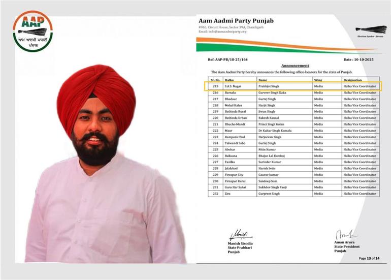 ਮੋਹਾਲੀ। - ਆਮ ਆਦਮੀ ਪਾਰਟੀ ਪੰਜਾਬ ਵੱਲੋਂ ਵਿਧਾਨ ਸਭਾ ਹਲਕਿਆਂ ਵਿੱਚ ਪਾਰਟੀ ਨੂੰ ਹੋਰ ਮਜਬੂਤ ਕਰਨ ਲਈ ਵੱਖ-ਵੱਖ ਵਿੰਗਾ ਲਈ ਮੀਡੀਆ ਹਲਕਾ ਵਾਈਸ ਕੋਆਡੀਨੇਟਰ ਤਾਇਨਾਤ ਕੀਤੇ ਗਏ ਹਨ। ਆਮ ਆਦਮੀ ਪਾਰਟੀ ਦੇ ਪੰਜਾਬ ਦੇ ਪ੍ਰਧਾਨ ਅਮਨ ਅਰੋੜਾ ਤੇ ਸੂਬਾ ਪ੍ਰਭਾਰੀ ਮਨੀਸ਼ ਸਿਸੋਦੀਆ ਵੱਲੋਂ ਜਾਰੀ ਕੀਤੇ ਪੱਤਰ ਅਨੁਸਾਰ ਮੋਹਾਲੀ ਸ਼ਹਿਰ ਦੇ ਵਸਨੀਕ ਅਤੇ ਸਮਾਜਸੇਵੀ ਪ੍ਰਭਜੋਤ ਸਿੰਘ ਨੂੰ ਹਲਕਾ ਮੋਹਾਲੀ ਦਾ ਮੀਡੀਆ ਹਲਕਾ ਵਾਈਸ ਕੋਆਡੀਨੇਟਰ ਨਿਯੁਕਤ ਕੀਤਾ ਗਿਆ ਹੈ। ਜ਼ਿਕਰਯੋਗ ਹੈ ਕਿ ਪ੍ਰਭਜੋਤ ਸਿੰਘ ਹਲਕਾ ਮੋਹਾਲੀ ਤੋਂ ਕਾਫੀ ਲੰਬੇ ਸਮੇਂ ਤੋਂ ਆਮ ਆਦਮੀ ਪਾਰਟੀ ਦੀ ਸੇਵਾ ਅਤੇ ਸਮਾਜ ਸੇਵਾ ਦਾ ਵੀ ਕੰਮ ਕਰਦੇ ਆ ਰਹੇ ਹਨ।