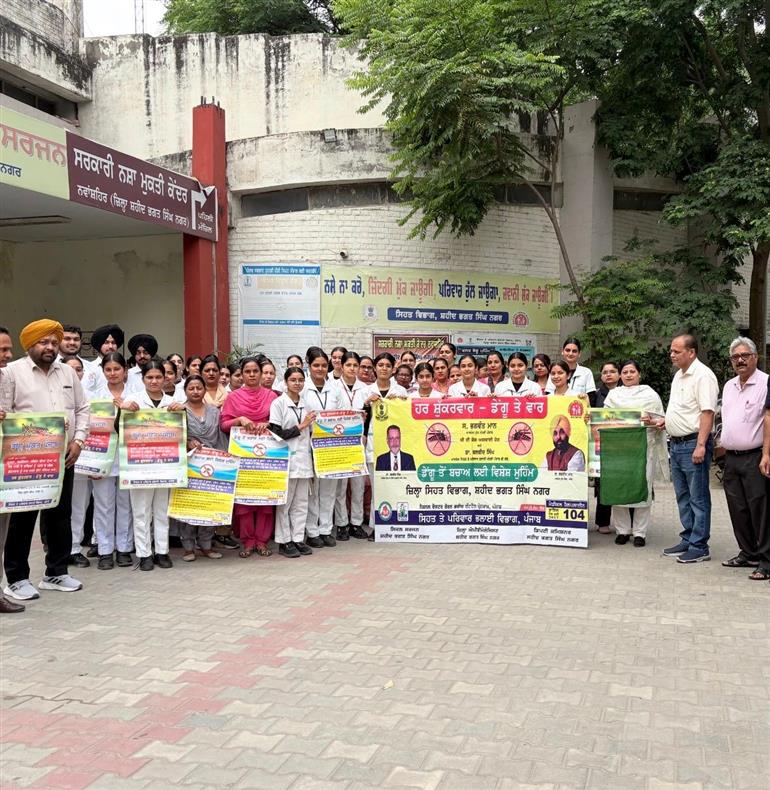 ਨਵਾਂਸ਼ਹਿਰ (ਮਨੋਰੰਜਨ ਕਾਲੀਆ) : ਮਾਣਯੋਗ ਸਿਹਤ ਤੇ ਪਰਿਵਾਰ ਭਲਾਈ ਮੰਤਰੀ ਡਾ. ਬਲਬੀਰ ਸਿੰਘ ਜੀ ਦੇ ਹੁਕਮਾਂ ਅਨੁਸਾਰ ਮਾਣਯੋਗ ਸਿਵਲ ਸਰਜਨ ਡਾ ਗੁਰਿੰਦਰਜੀਤ ਸਿੰਘ ਜੀ ਦੀ ਯੋਗ ਰਹਿਨੁਮਾਈ ਹੇਠ ਜ਼ਿਲ੍ਹਾ ਸਿਹਤ ਵਿਭਾਗ, ਸ਼ਹੀਦ ਭਗਤ ਸਿੰਘ ਨਗਰ ਨੇ ਡੇਂਗੂ ਦੀ ਬਿਮਾਰੀ 'ਤੇ ਸਮੇਂ ਸਿਰ ਕਾਬੂ ਪਾਉਣ ਤੇ ਕਮਿਊਨਿਟੀ ਦੀ ਭਾਗੀਦਾਰੀ ਨੂੰ ਹੋਰ ਵਧਾਉਣ ਲਈ "ਹਰ ਸ਼ੁੱਕਰਵਾਰ ਡੇਂਗੂ 'ਤੇ ਵਾਰ" ਮੈਗਾ ਮੁਹਿੰਮ ਦੀ ਸ਼ੁਰੂਆਤ ਕੀਤੀ ਹੈ। ਇਸੇ ਦੌਰਾਨ ਸੰਧੂ ਨਰਸਿੰਗ ਕਾਲਜ ਦੀਆਂ ਵਿਦਿਆਰਥਣਾਂ ਦੇ ਸਹਿਯੋਗ ਨਾਲ ਸਿਵਲ ਸਰਜਨ ਦਫਤਰ, ਸ਼ਹੀਦ ਭਗਤ ਸਿੰਘ ਨਗਰ ਤੋਂ ਬਾਰਾਂਦਰੀ ਗਾਰਡਨ, ਨਵਾਂਸ਼ਹਿਰ ਤੱਕ ਡੇਂਗੂ ਵਿਰੋਧੀ ਜਾਗਰੂਕਤਾ ਰੈਲੀ ਕੱਢੀ ਗਈ, ਜਿਸ ਨੂੰ