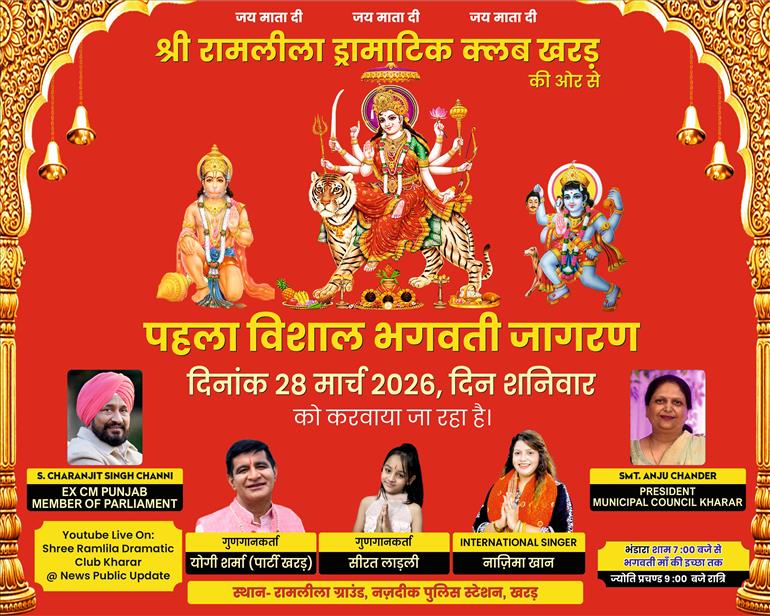 ਖਰੜ (ਪ੍ਰੀਤ ਪੱਤੀ) : ਸ੍ਰੀ ਰਾਮਲੀਲਾ ਡਰਾਮਾਟਿਕ ਕਲੱਬ ਖਰੜ ਵੱਲੋਂ ਇਲਾਕਾ ਨਿਵਾਸੀ ਦੇ ਸਹਿਯੋਗ ਨਾਲ ਪਹਿਲਾ ਵਿਸ਼ਾਲ ਭਗਵਤੀ ਜਾਗਰਨ ਬੜੀ ਸ਼ਰਧਾ ਦੇ ਉਤਸਾਹ ਨਾਲ 28 ਮਾਰਚ 2026 ਦਿਨ ਸ਼ਨੀਵਾਰ ਨੂੰ ਰਾਮਲੀਲਾ ਗਰਾਊਂਡ ਨੇੜੇ ਪੁਲਿਸ ਸਟੇਸ਼ਨ ਖਰੜ ਵਿਖੇ ਕਰਾਇਆ ਜਾ ਰਿਹਾ ਹੈ। ਕਲੱਬ ਦੇ ਪ੍ਰਬੰਧਕ ਨੇ ਦੱਸਿਆ ਕਿ ਜਾਗਰਨ ਦੀ ਸ਼ੁਰੂਆਤ 9 ਵਜੇ ਜੋਤੀ ਪ੍ਰਚੰਡ ਨਾਲ ਕੀਤੀ ਜਾਵੇਗੀ ਇਸ ਤੋਂ ਪਹਿਲਾਂ ਸ਼ਾਮ 7 ਵਜੇ ਤੋਂ ਪ੍ਰਭੂ ਦੀ ਇੱਛਾ ਤੱਕ ਵਿਸ਼ਾਲ ਭੰਡਾਰਾ ਵਰਤਾਇਆ ਜਾਵੇਗਾ ਇਸ ਮੌਕੇ ਮੁੱਖ ਗਾਇਕ ਅਤੇ ਕਲਾਕਾਰ ਯੋਗੀ ਸ਼ਰਮਾ ਐਂਡ ਪਾਰਟੀ ਨਾਜੀਮਾ ਖਾਨ ਸ਼ੀਤਲ ਲਾਡਲੀ ਆਪਣੀਆਂ ਭੇਟਾਂ ਰਾਹੀਂ ਸੰਗਤਾਂ ਨੂੰ ਨਿਹਾਲ ਕਰਨਗੇ।